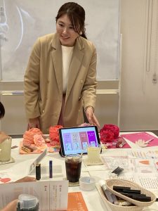 ”自分らしさが輝く色と出会う90分”というサブタイトルのもと、参加者の心に優しく語りかけてくれる松井先生。第一印象のチェックから、簡易パーソナルカラー診断、似合うリップカラーで印象チェンジ体験、大人女性に嬉しい”ピンクの効能”と似合う選び方、等々・・・楽しく心地良いお声のトーンに癒されながら似合うリップ×肌色を診断いただく90分でした。